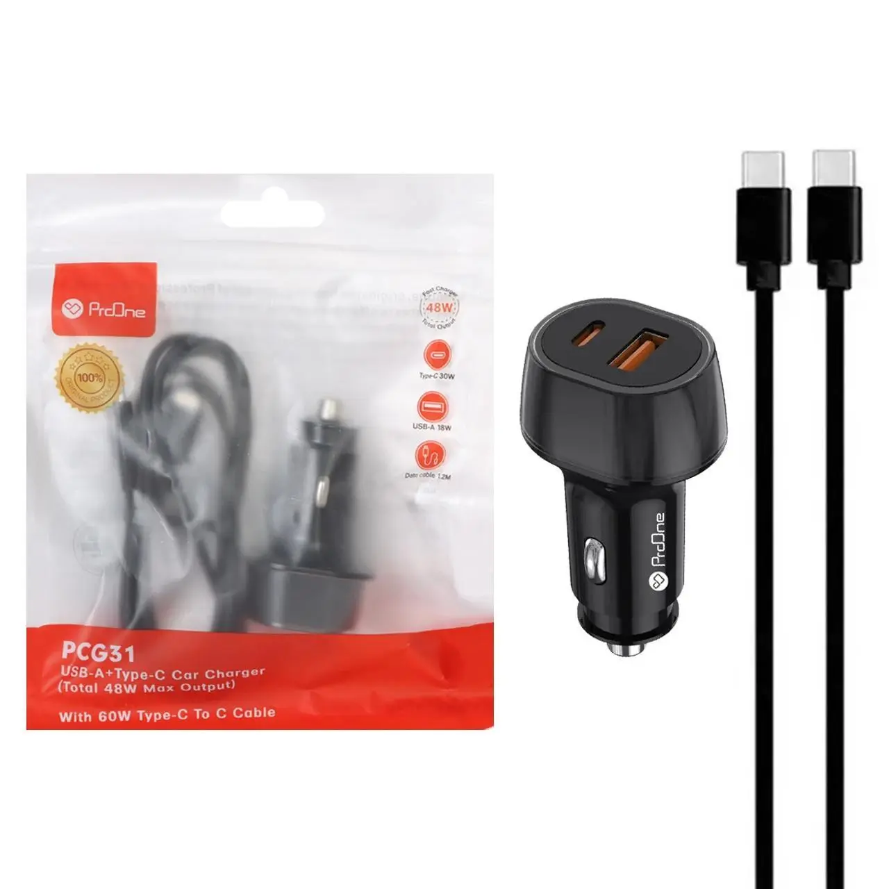 شارژر فندکی فست دو پورت ProOne مدل PCG31 48w به همراه کابل شارژ Type-C To Type-C