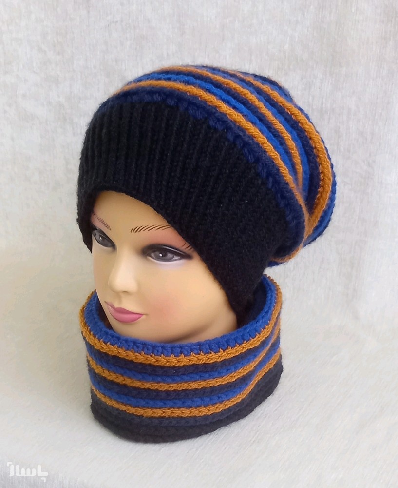 به صورت چند رنگ بافته شده . رنگها در تصویر مشخص است . نرم و گرم لطیف و مناسب برای دور سر 57 تا 65 سانت .