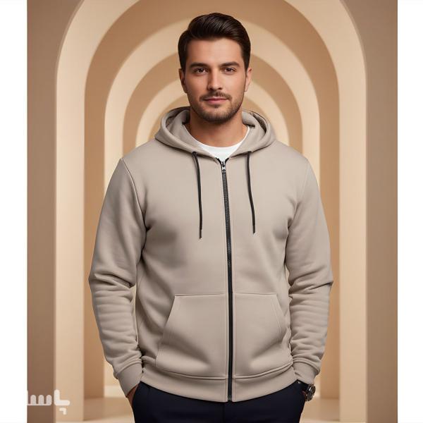 سویشرت دورس کلاهدار زیپی سهنخ پنبه داخل کرک رنگ کرمی– گرم، راحت و باکیفیت