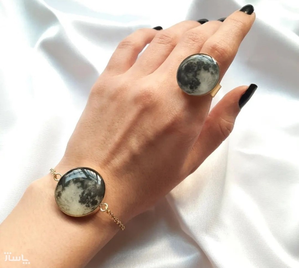 این انگشتر زیبا با فریم برنجی قابلیت تغییر سایز دارد ،دستبند از فریم برنجی و آویز رنگ ثابت ساخته شده و با جذب نور در تاریکی به رنگ آبی دیده میشوند
