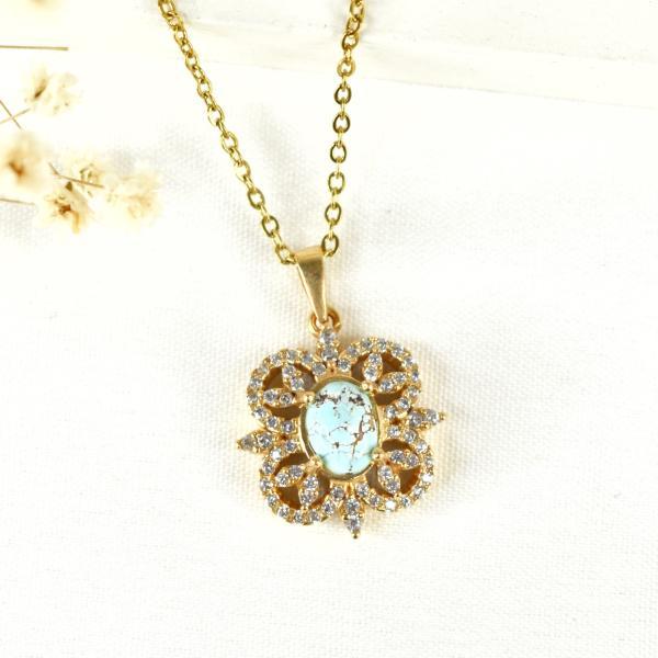 گردنبند طلاروس طرح گل با سنگ فیروزه نیشابور مشابه طلا کد 8787