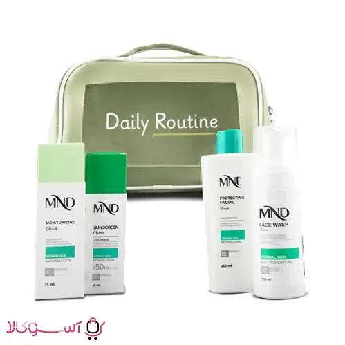 پک روتین پوستی ام ان دی مناسب پوست های نرمال بوده. و شامل فوم شستشو، تونر صورت محافظت کننده، کرم مرطوب کننده و کرم ضدآفتاب است.