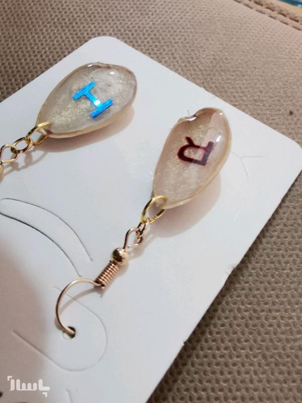 گوشواره دست ساز اپوکسی کاج مدل حروف طرح پسته طبیعی برند E.K