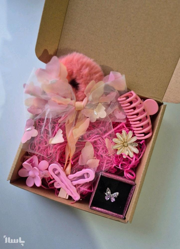 آیتم های باکس : کشموی پاپیون پینترستی،مینی کلیپس شمعی،سنجاق مو بابونه،انگشتر پروانه نگیندار و جعبه انگشتر،کلیپس گل، سنجاق مو، باکس و پوشال
