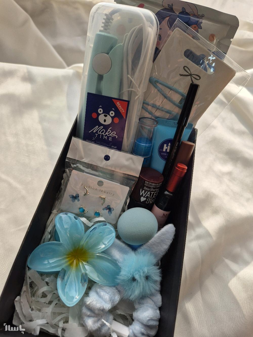 آیتم ها : ماسک ورقه ای، پک گلسر،اتومو،مدادچشم،لیفت ابرو،کرم دست،رژمایع،تینت شامپاینی،تینت ،پدقارچی،پک گوشواره آبی،کشموخرگوشی،کلیپس،باکس و پوشال