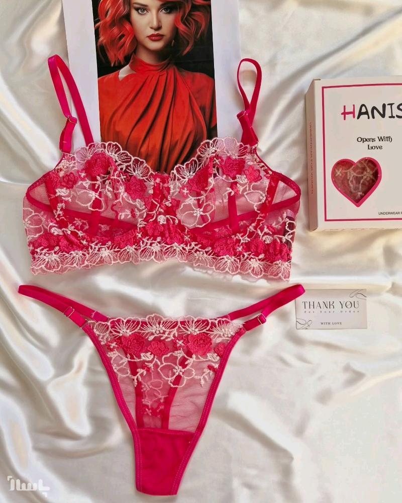 یه ست با زمینه رنگی صورتی پررنگ که زمینه گلی برجسته داره