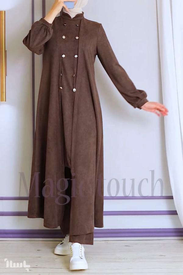رویه زنانه مخمل مدل مانتو بلند مخمل کبریتی دکمه دار سایزبندی کامل