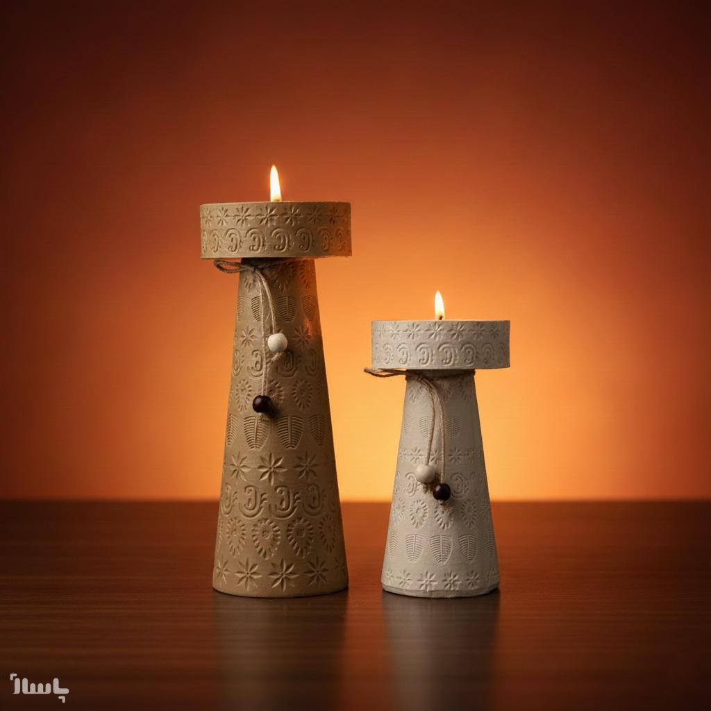 طراحی دو سایز: این ست شامل یک جاشمعی بزرگ و یک جاشمعی کوچک است که قرارگیری آنها کنار هم، عمق و جذابیت بصری ایجاد میکند. (لطفا ابعاد دقیق را برای تکمیل این بخش ارسال کنید.)