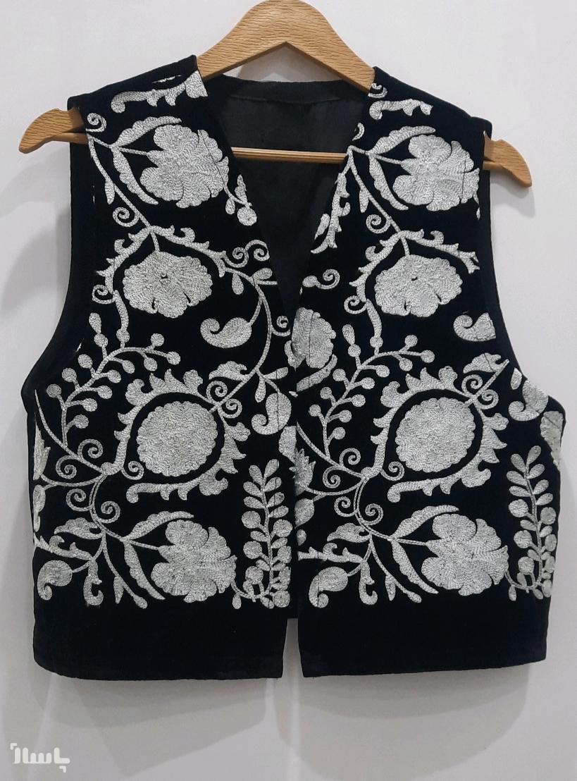 جنس ان مخمل سوزندوزی است. پشت کار سادست. قد ان حدود 50س است.گلدوزی روی جلیقه به رنگ طوسی است.