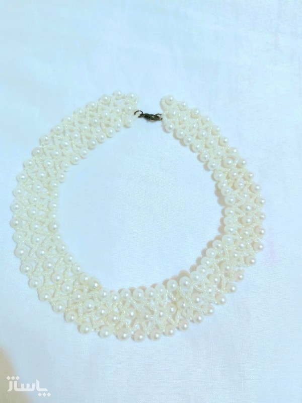گردنبند مروارید دستساز از مروارید و منجوق با نخ نامرئی و سوزن مخصوص منجوق دوزی درست شده است و با قفل و حلقه دور گردن فیکس میشود و خیلی زیبا و جلوه خاصی داره