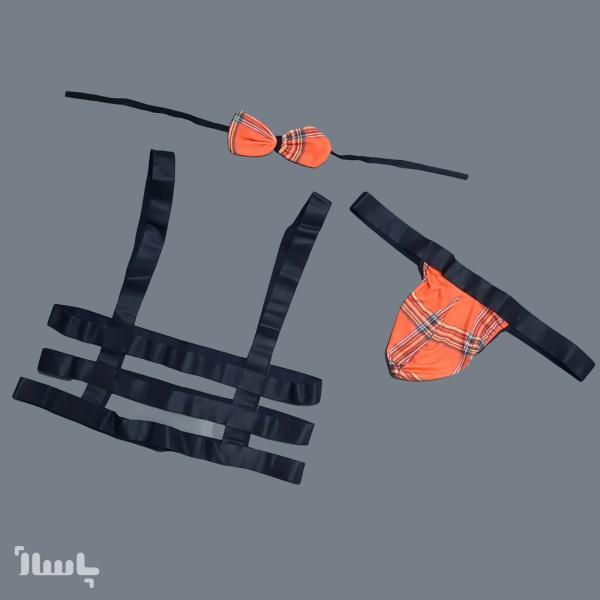 شورت کلاسیک: این شورت با پارچهای با زمینه قرمز و خطوط راهراه مشکی، سفید و سرمهای طراحی شده که شبیه به پارچههای کلاسیک دانشآموزی است. این طراحی به کاستوم جلوهای جذاب و خاص میدهد. ⬛⬜