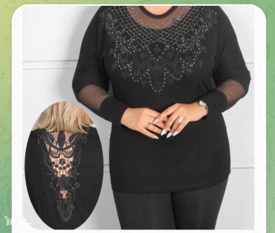 تونیک زنانه مجلسی جلو لباس دارای نقش گیپور ومروارید دوزی واز قسمت پشت لباس خرج کار گیپور استین لباس بلند ودارای خرج کار گیپور بلندی لباس 75قداستین.70استین کیمانودور کمر 106مچ آستین 22
