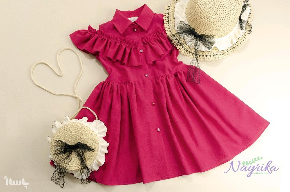پیراهن سرخابی دلبر با جزئیات چین دار، همراه با کلاه حصیری و کیف دستی بامزه