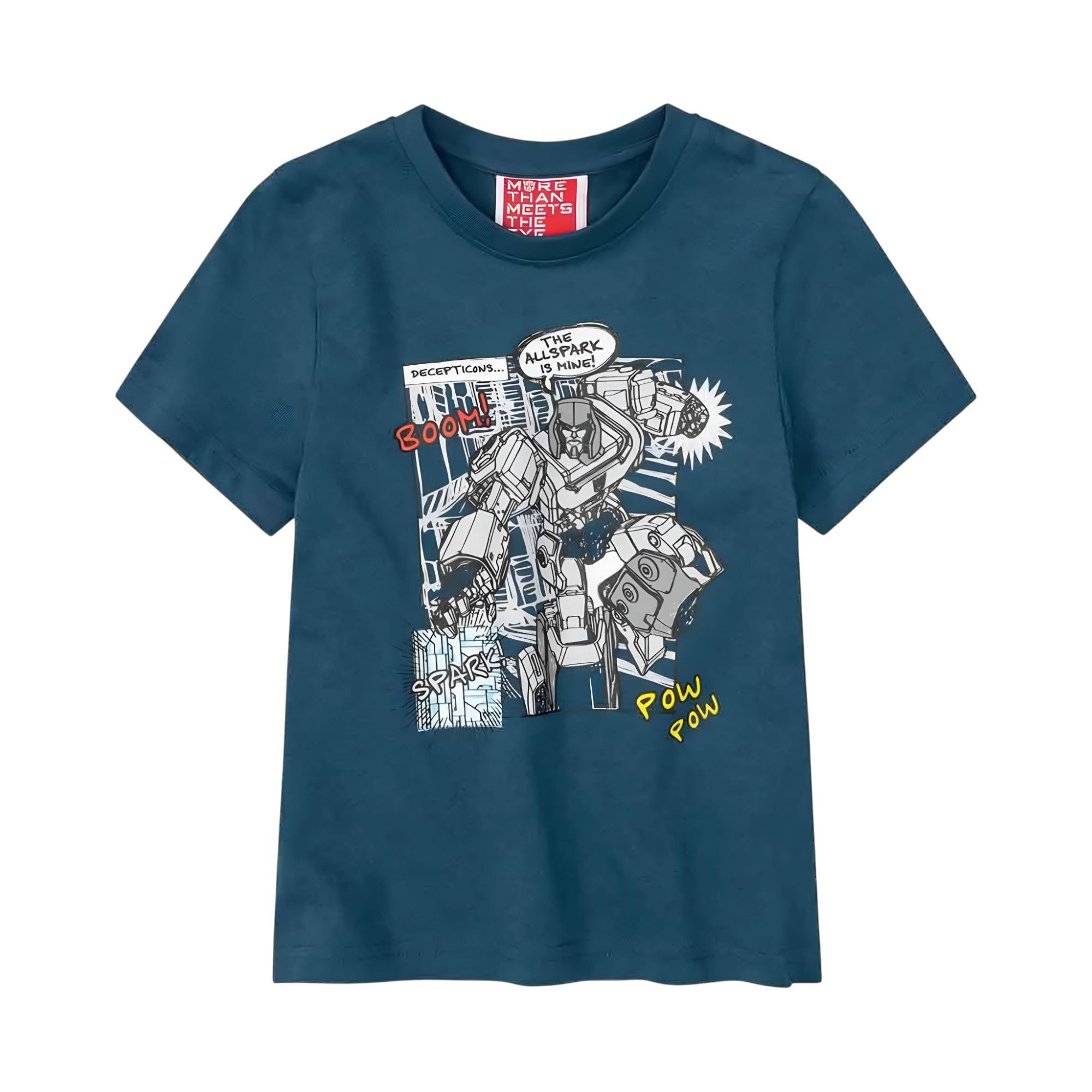 ن تیشرت پسرانه از جنس پنبه با طرح ویژه از داستان معروف ترنسفورمرز طراحی شده است. تصویر روی تیشرت نمایشی از یک ربات قدرتمند، بهشکل کامیک، به همراه عبارات BOOM! و POW POW و SPARK در حال عملکرد خود را نشان میدهد. عبارت THE ALLSPARK IS MINE! به صورت برجسته در بالای تصویر قرار گرفته است، که اشاره مستقیمی به موضوع اصلی فیلمها و انیمههای ترنسفورمرز است.