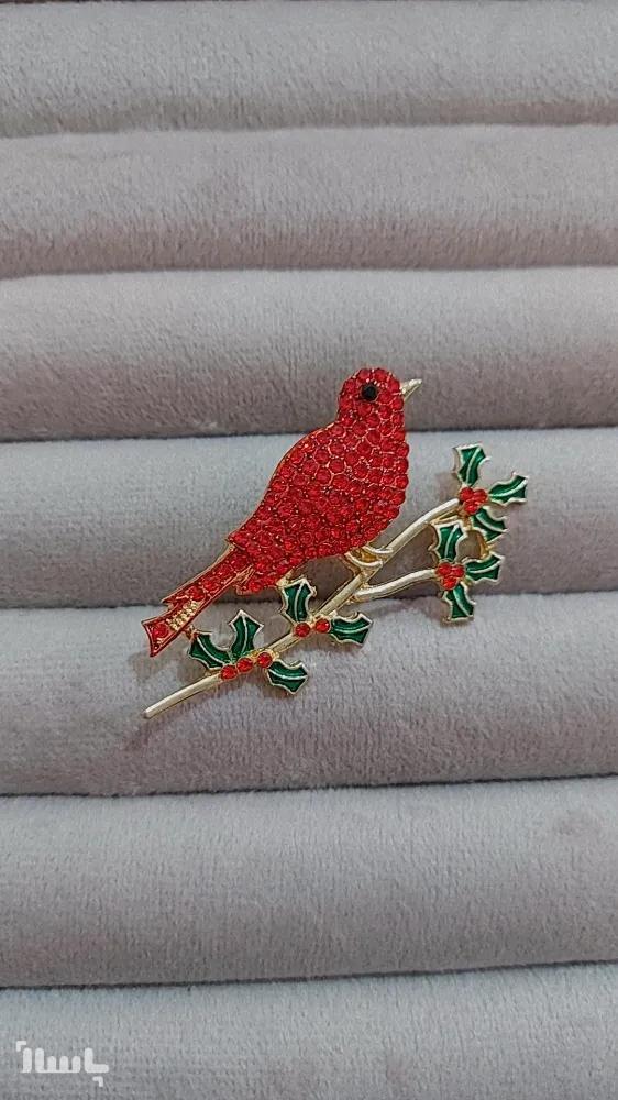 سنجاق سینه پرنده نگیندار جواهری قرمز روی شاخه برگ سبز