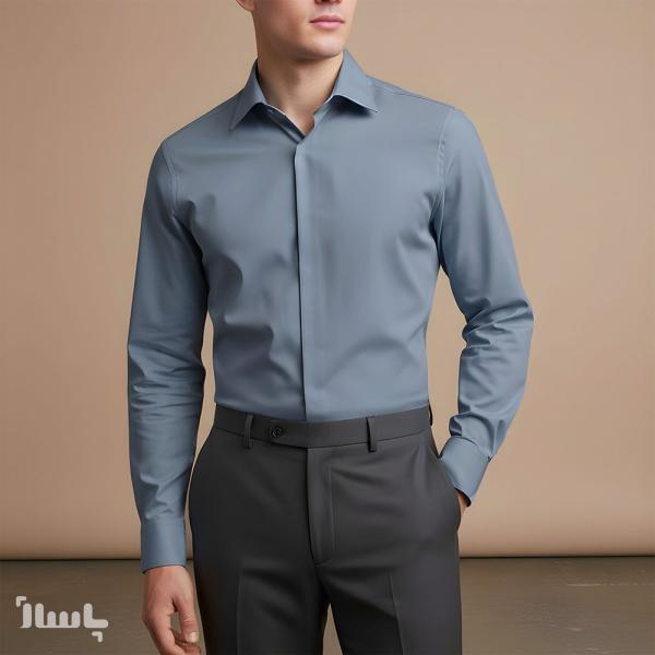 پیراهن مردانه ساده آستین بلند رنگ طوسی آبی– استایل شیک و رسمی