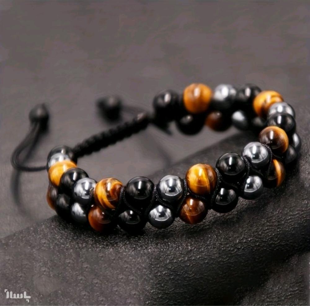 **معرفی محصول: دستبند دو ردیفه سنگ چشم ببر، حدید گرد دودی و اونیکس مشکی براق**