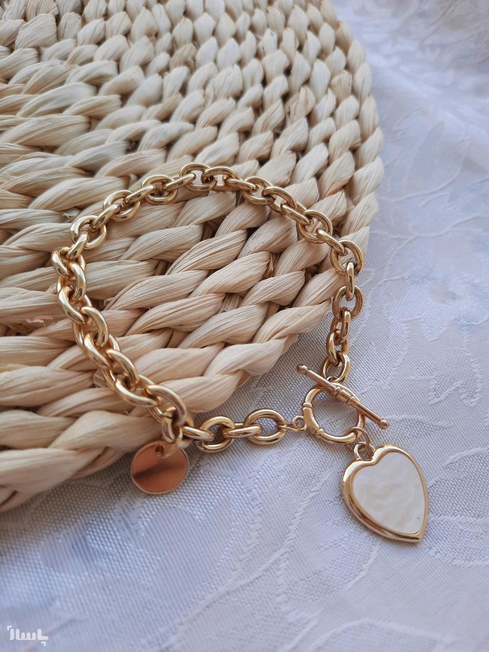 دستبند وارداتی با آویز صدفی قلب دارای قفل تی با آبکاری طلایی بر پایه مس