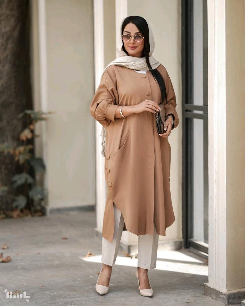 قد لباس از جلو 105 از پشت 110 قد استین 60 جلوی لباس سه تا دکمه نما و از زیر تا زانو دکمه مخفی داره و دو عدد جیب در دو سایز سایز یک مناسب تا 44 و سایز دو مناسب تا 52