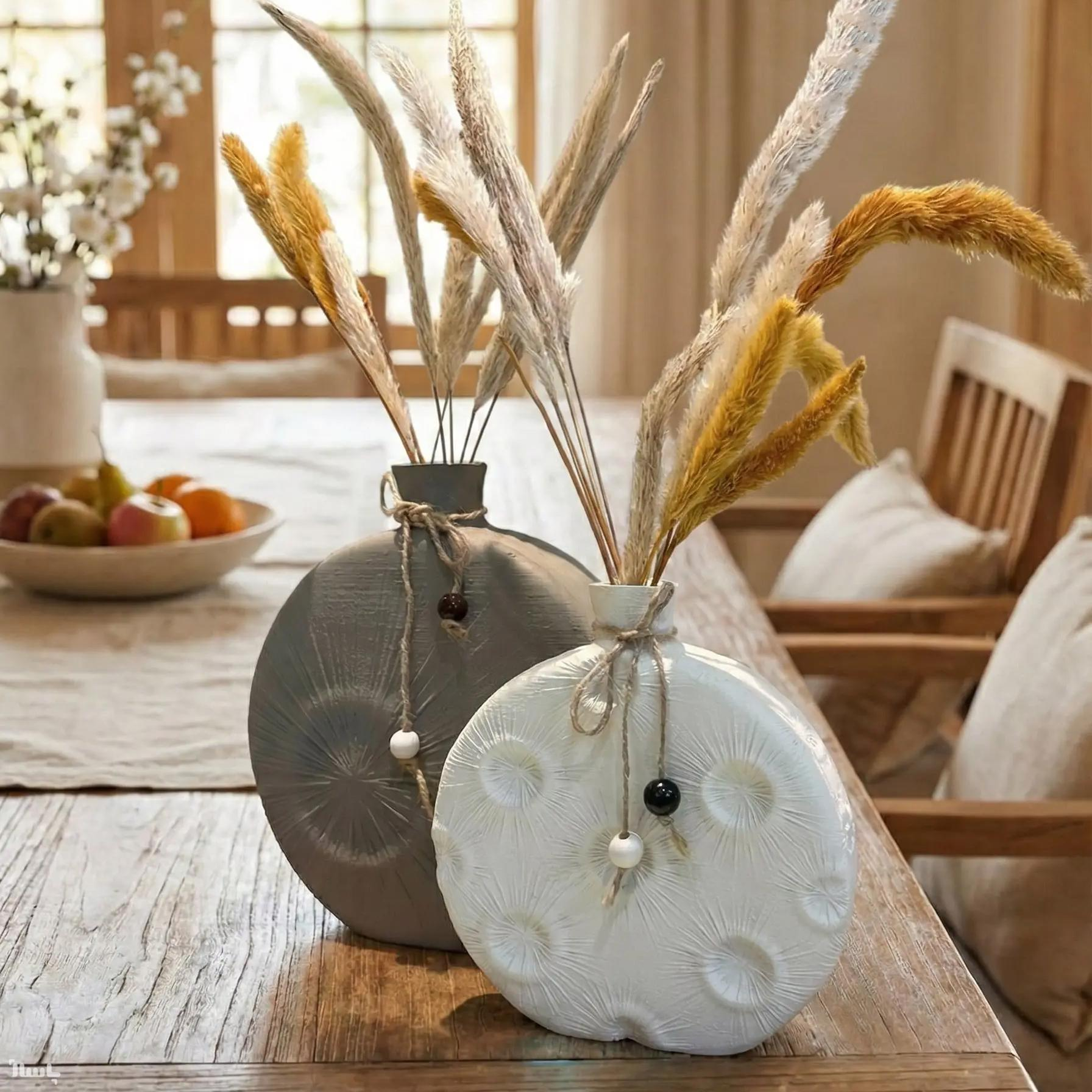 زیبایی در هماهنگی: این گلدانها به صورت دوتایی و مکمل طراحی شدهاند که چیدمان آنها در کنار هم، یک منظره زیبا خلق میکند و برای قرار دادن گلهای خشک (مانند پمپاس گراس) یا شاخههای تزئینی بسیار مناسب است.