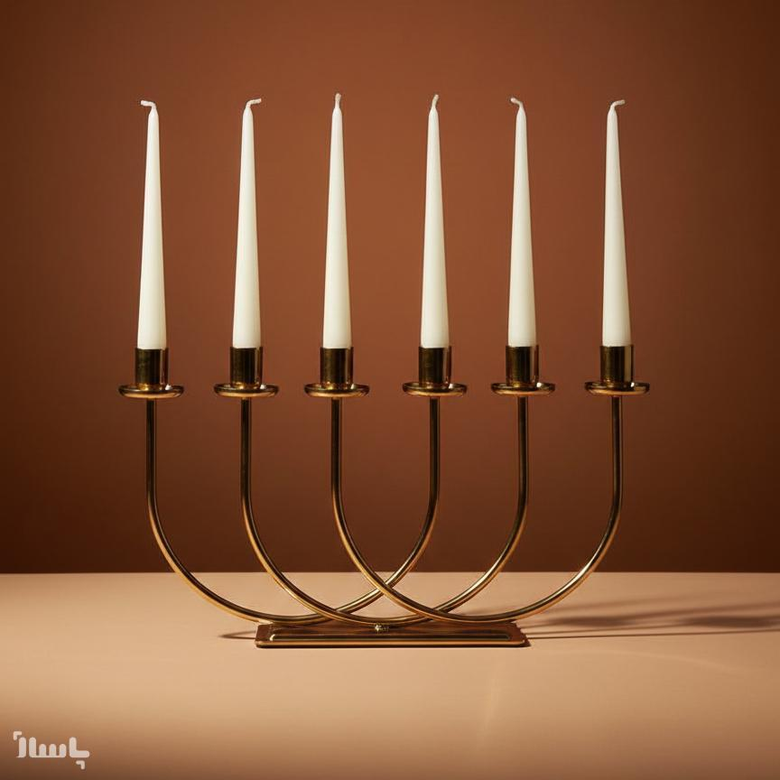 طراحی متقارن: پایه فلزی منحنی شکل، شش نگهدارنده شمع را با فاصلهای مناسب کنار هم قرار داده و جلوهای متقارن به آن میبخشد.