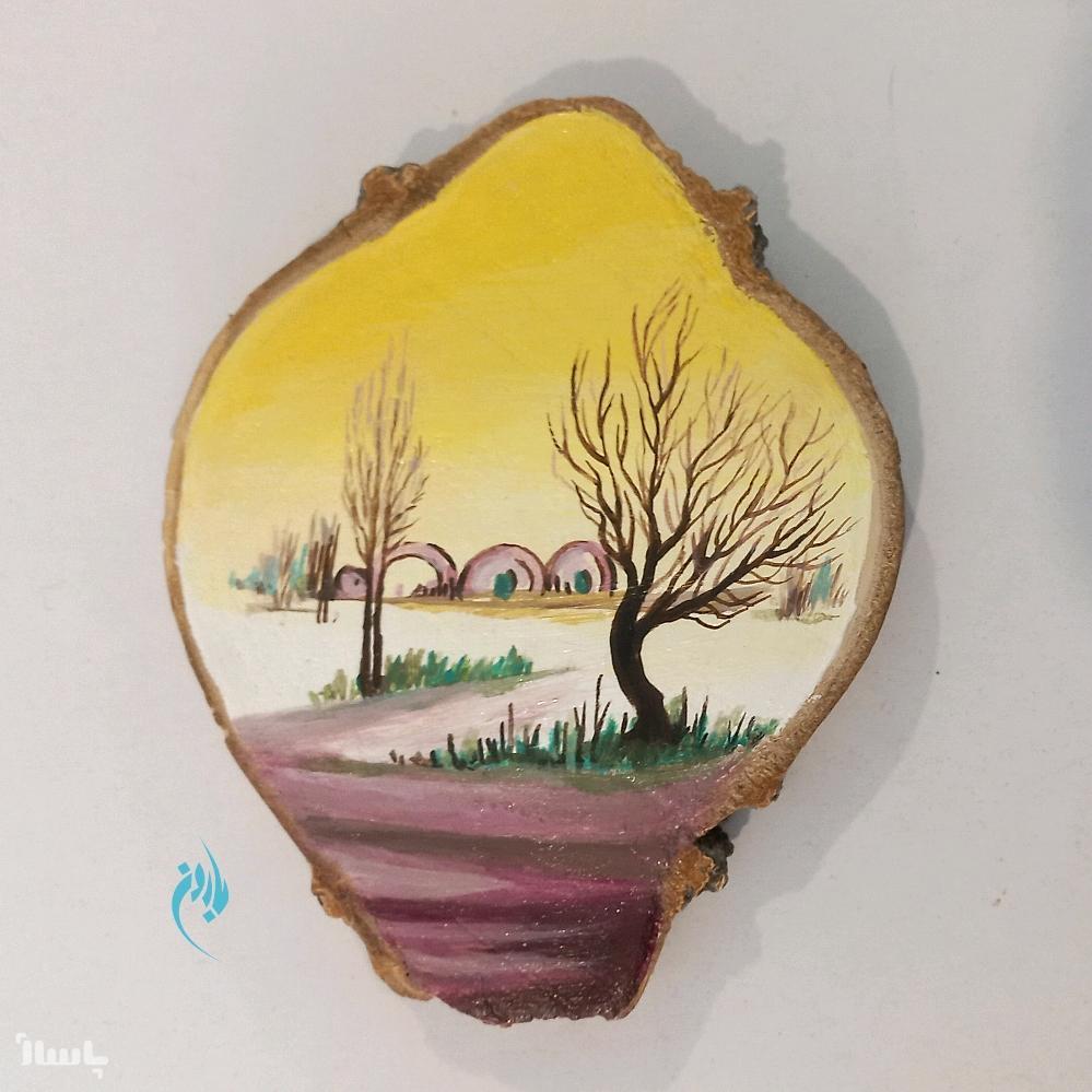 این نقاشی چوبی تکهای طبیعته چون روی برشی کالباسی از درخت اجرا شده و با طرح روستا جانی تازه به زندگی درخت داده