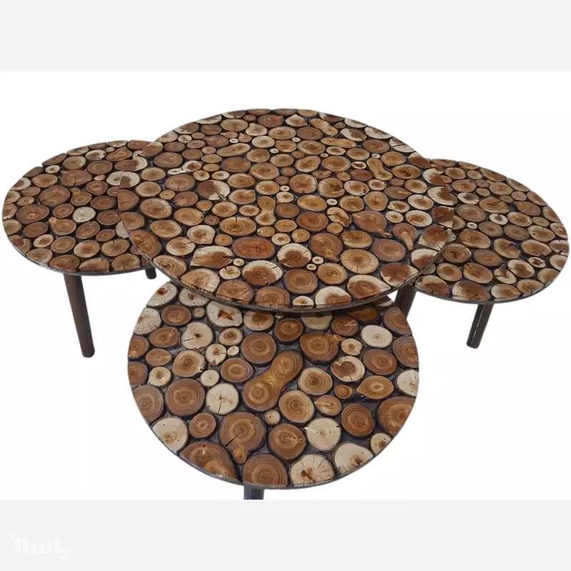 میز وسط به همراه سه تا عسلی ساخته شده با تیکه چوب زردالو یه کار منحصر به فرد و خاص دارم که با رنگ طبیعی خود چوب زردالو تقدیم شما میشه رنگ پایه ها قابل تغییر است