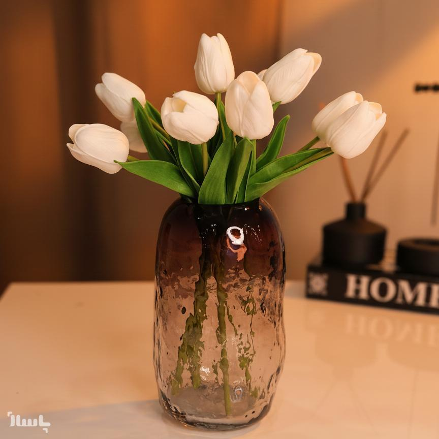 لالههای مصنوعی به تنهایی در یک گلدان شیشهای (مانند تصویر) یا گلدانهای بلند با رنگهای خنثی، جلوهای شیک و کلاسیک میآفرینند. آنها برای میز ناهارخوری، روی پیانو یا میز کنسول در ورودی خانه، یک انتخاب عالی و نمادین هستند.