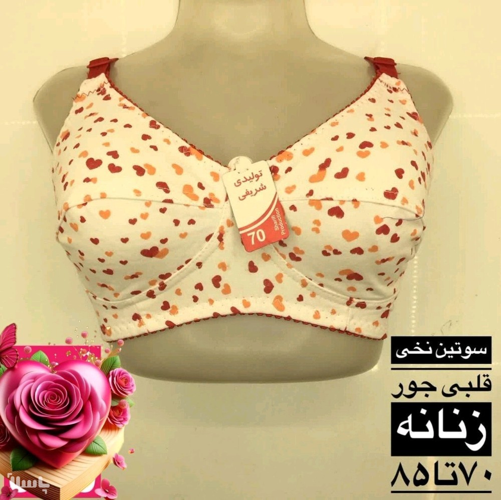 سوتین نخی دو لایه، طرح قلبی، در دو رنگ با زمینه سفید با قلبهای سبز آبی،، نارنجی در سایز های 85 70،75،80، از هر سایز سه عدد موجودی دارم