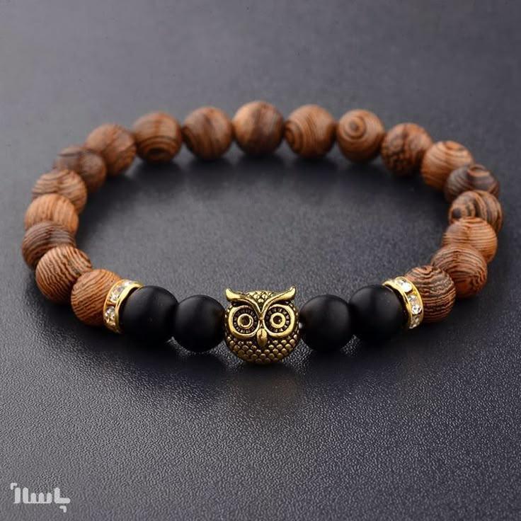 دستبند اونیکس و چوب با پلاک جغد طلایی