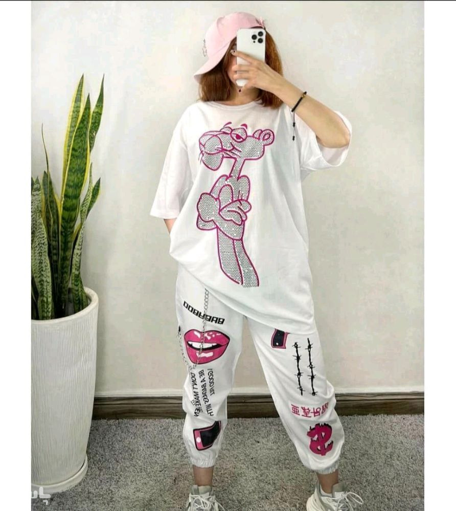 نام : ست دوتیکه تیشرت شلوار پرطرفدار پلنگ صورتی نگین کاری شده