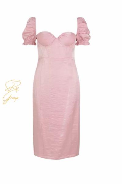 توضیحات پیراهن مجلسی کاپ دار صورتی با نام تجاری PUFF SLEEVE CUP DETAIL BODYCON MIDI طبق سایت Boohoo: