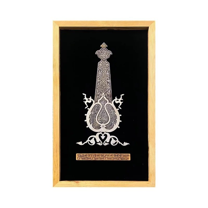 قاب تیغه علامت مزین به نام زیبای الله در کنار 5 تن میباشد اما این تنها حسن این قاب نیست بلکه طراحی خلاقانه و هنری آن نیز قابل توجه است که این اسامی پربرکت و زیبا بر روی نمایی کوچک از علم های دستههای محرمی حک شده است.