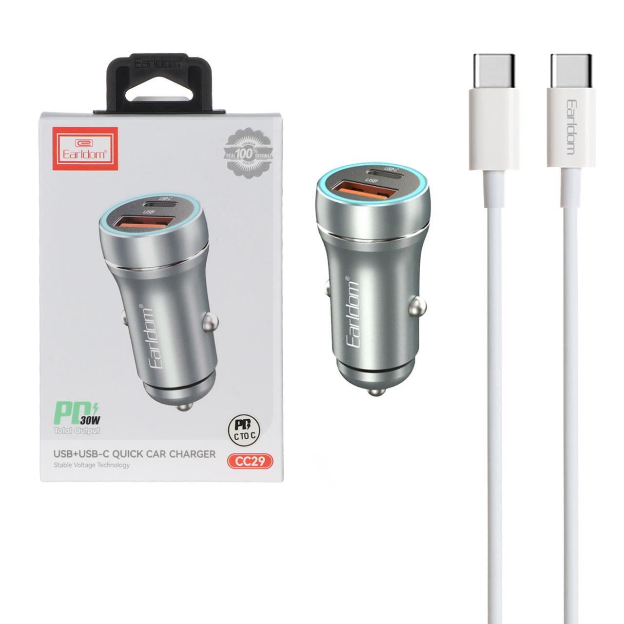 شارژر فندکی PD و فست دو پورت Earldom مدل CC29 30W به همراه کابل شارژ Type-C To Type-C