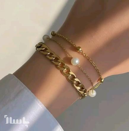 دستبند استیل و رنگ ثابت سه ردیفهکارتیر و مروارید و زنجیر توپی
