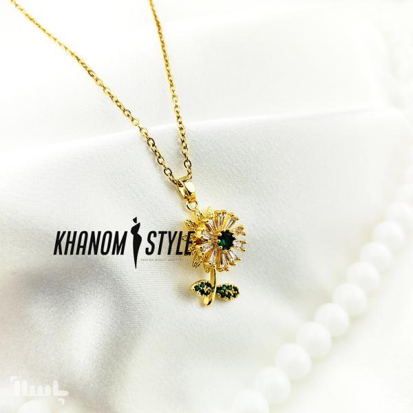 گردنبند استیل طلایی طرح گل نگین سبز (اسپینر یا چرخشی)