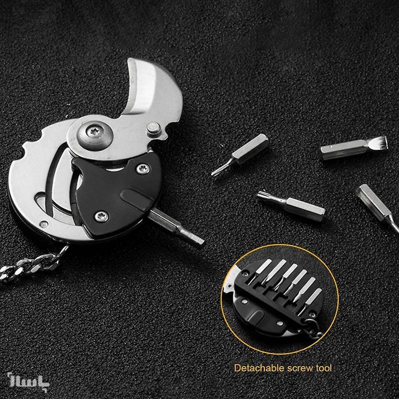 این چاقوی تاکتیکال سکه ای شکل دارای ویژگی های متنوع و کاربردیست. 1-دارای 6 سری پیچ گوشتی: این محصول کاربردی 6 سر پیچ گوشتی با خود به همراه دارد که قسمتی برای قرار دادن انها دارد و براحتی میتوانید از آنها استفاده کنید. 2- جنس بدنه ی محکم فولادی: علاوه بر اینکه این محصول سبک و قابل حمل بوده، دارای جنس فوقالعاده است که به راحتی اسیب نبیند. 3- دارای زنجیر آویز یا همان جاکلیدی
