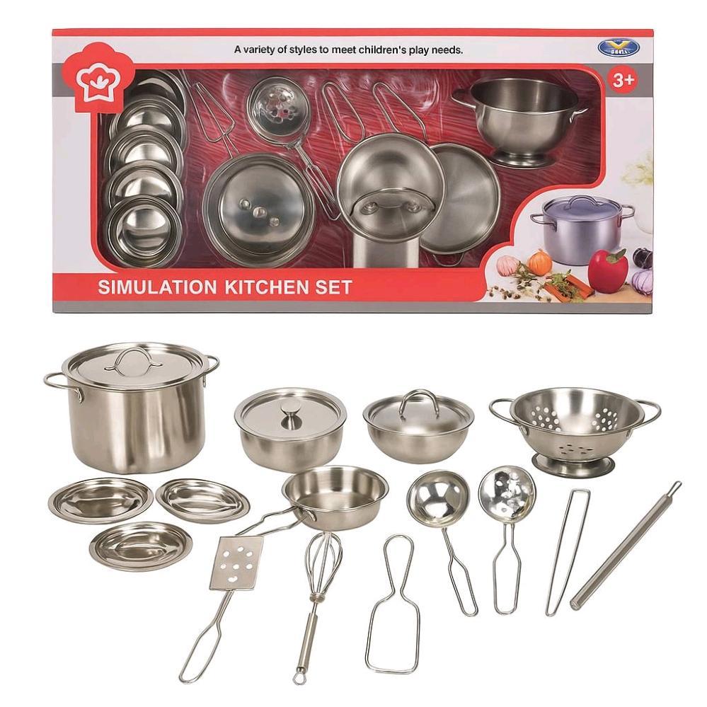ست آشپزخانه شبیهسازی شده مخصوص کودکان بالای 3 سال، شامل انواع قابلمه، ماهیتابه، آبکش، کفگیر، ملاقه و ابزارهای آشپزی با طراحی کاملا واقعگرایانه و کیفیت بسیار بالا است.