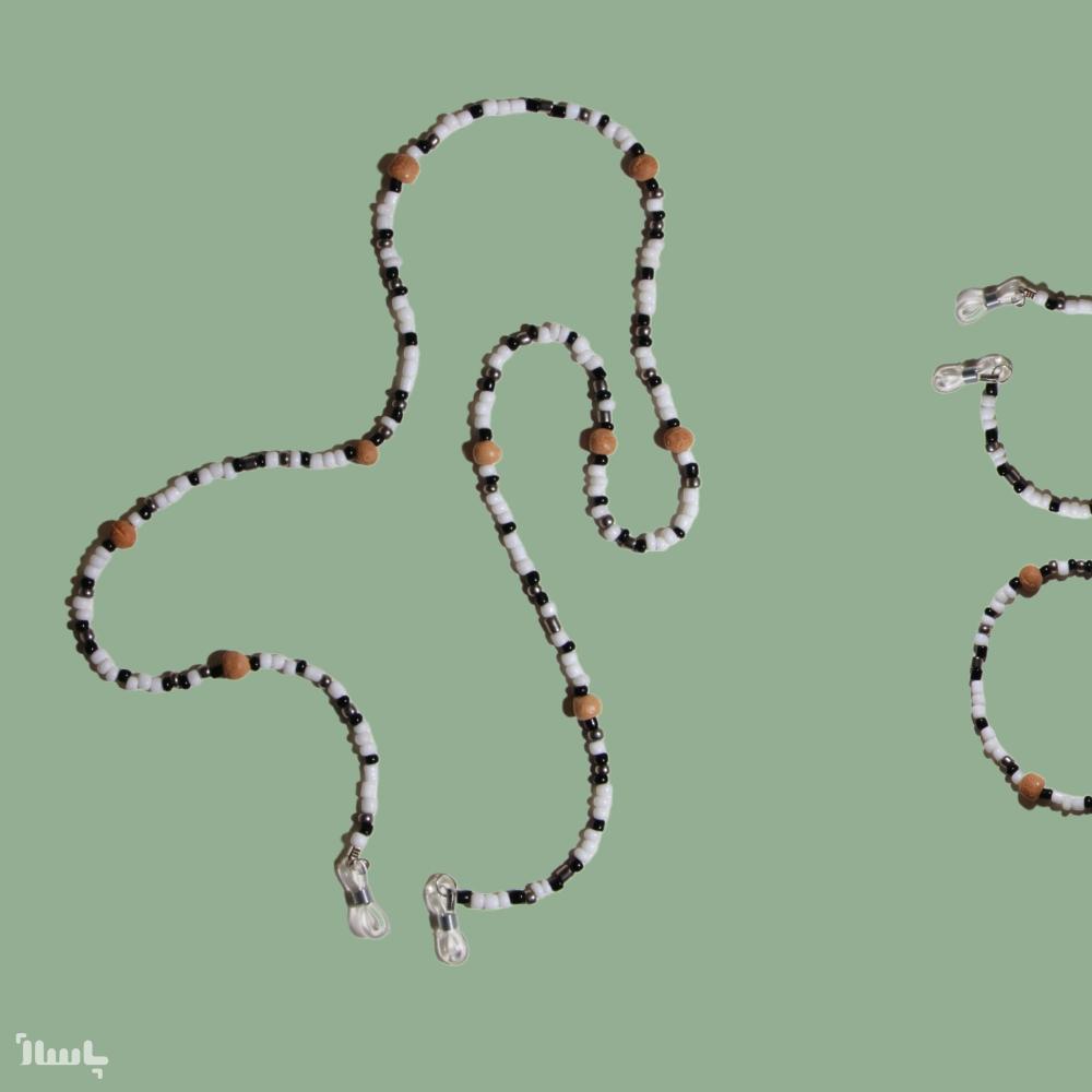 ترکیب منجوق سفید و مشکی و نقره ای و مهره چوبی