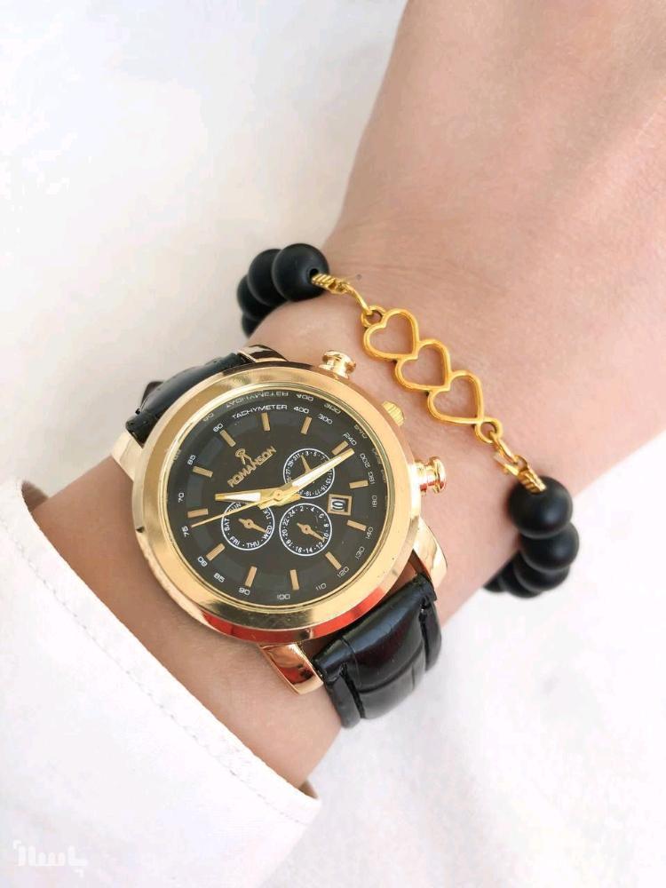 ساعت زنانه بند چرم مشکی صفحه مشکی رومانسون + دستبند مهرهای مشکی