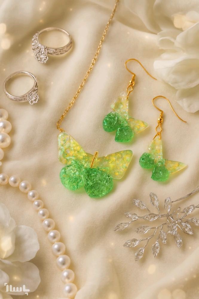 یک جفت گوشواره آویز با گردنبند رزینی دستساز با زنجیر رنگ ثابت