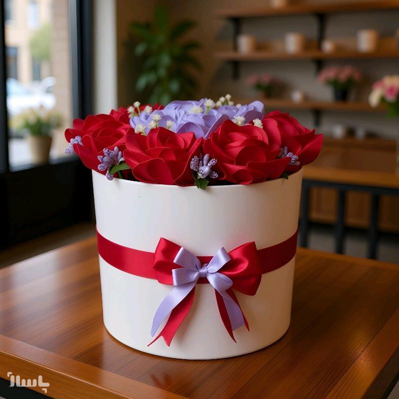 باکس گل ربانی گل رز یاسی و زرشکی مناسب هدیه، روز مرد، روز پدر، ولنتاین