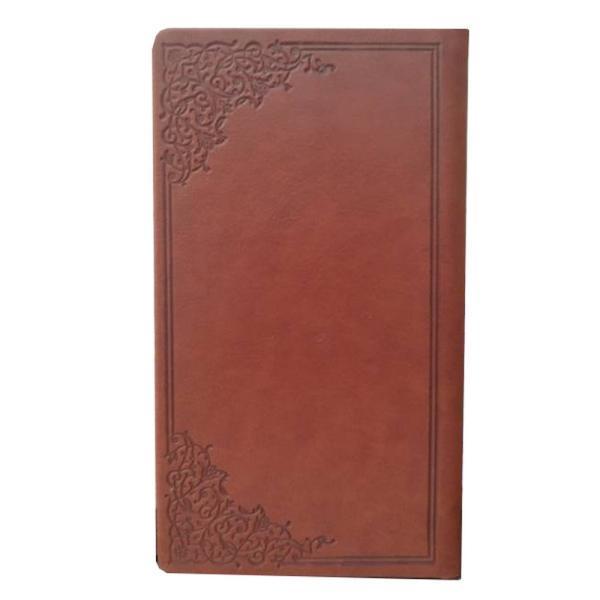 سالنامه ی نفیس چرمی نوع کاغذ تحریر معمولی دراندازه ی 9*17 سانتی متر قطع پالتویی قابلیت چاپ لوگو به صورت داغی دارای حاشیه رنگی و تذهیب های خیره کننده حاوی تمامی مناسب ها بسیار نفیس و ارزنده جهت خرید ارگان ها و پک های تبلیغاتی