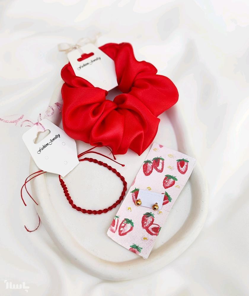 گوشواره گوی طلایی اسکرانچی دستبند قرمز روز دختر