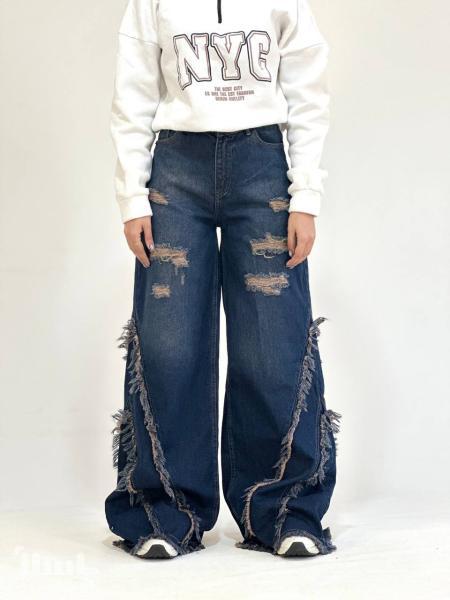 شلوار فول بگ سرمه ای بغل دمپا ریش زاپ دار