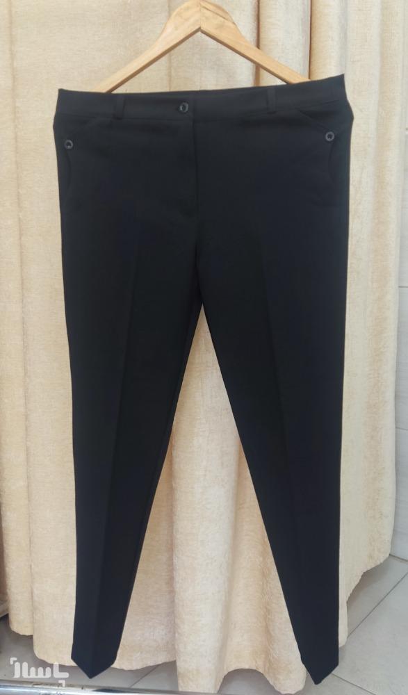 کمر شلوار پشت ساده و جلو همراه با دکمه و زیپ ، جیب نما دارد ، رنگ کاملا مشکی