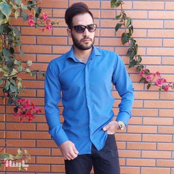 پیراهن مردانه آستین بلند دکمه مخفی رنگ آبی تیره