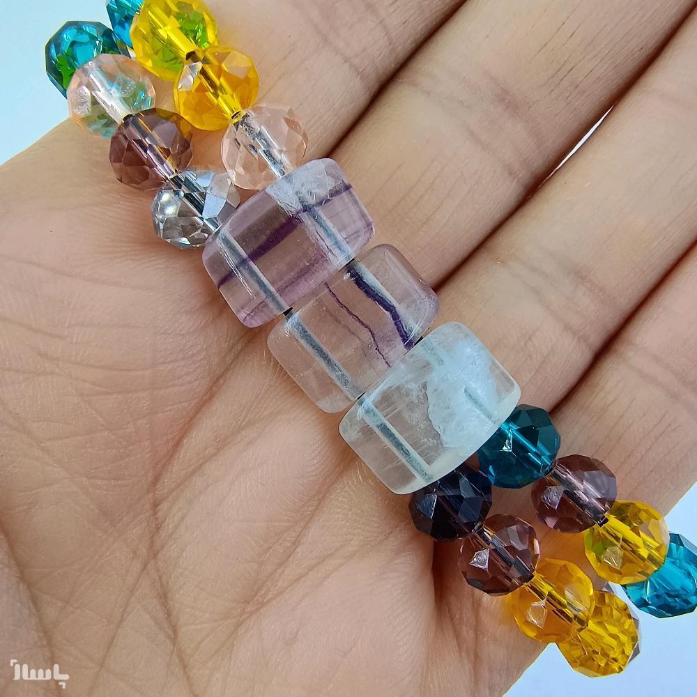 نام سنگ و مهره: سه مهره مرکزی مستطیل شکل فلورین یا فلوریت می باشند الباقی مهره ها کریستال رنگی صنعتی