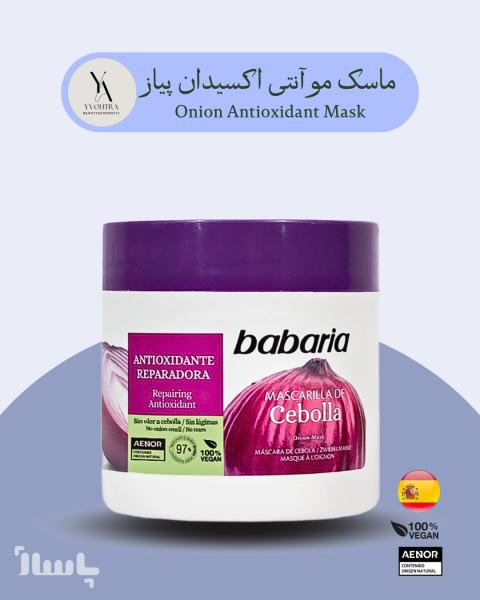 ماسک مو مغذی و ترمیمکننده پیاز باباریا Babaria حجم 400 میل حاوی آنتیاکسیدان و بدون سولفات مناسب انواع مو: نرمی و احیا