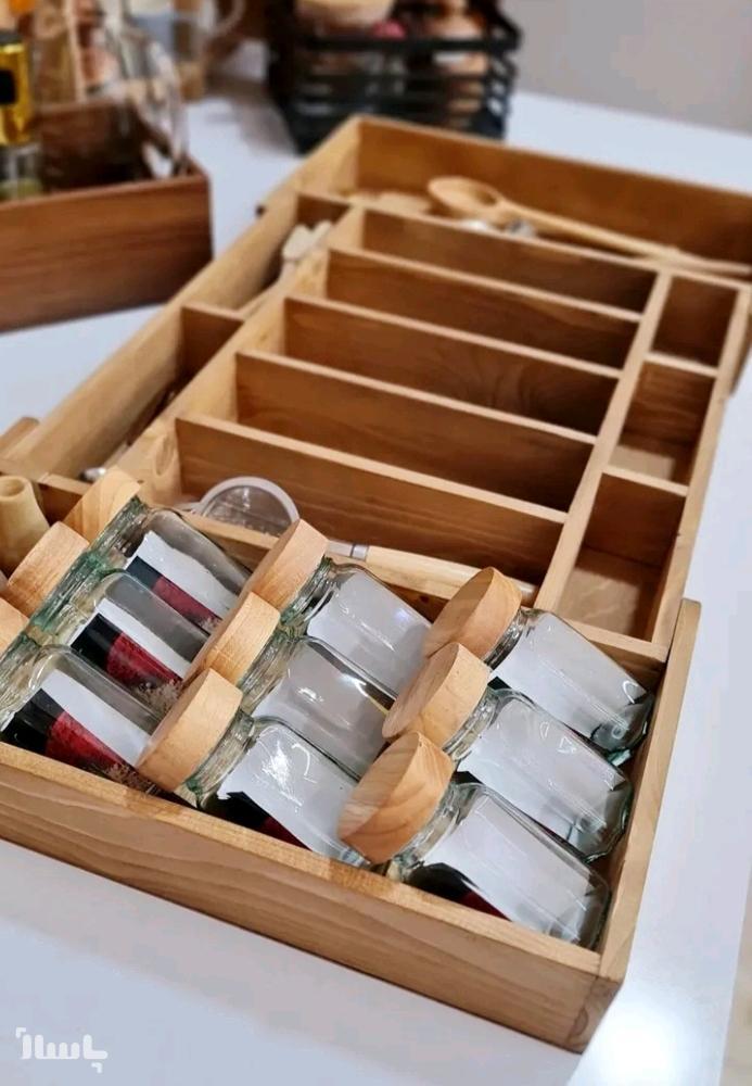 جاقاشقی چوبی کشویی ریلی با سه عدد استند ادویه مک کارتی، دارای بافت و گره طبیعی چوب